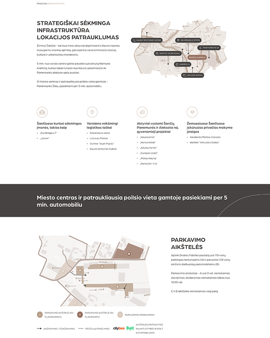 - UI/UX dizainas – išsigryninome dvi pagrindines auditorijas: lankytojai ir verslai. Sudėjome aiškią navigaciją. Minimalistinė, architektūrinė estetika, atitinkanti brandbook’o kryptį.